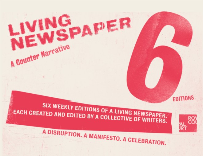 From 12 November 2020 the Royal Court Theatre will present six weekly editions of a living newspaper, each edition created and edited by a collective of writers.