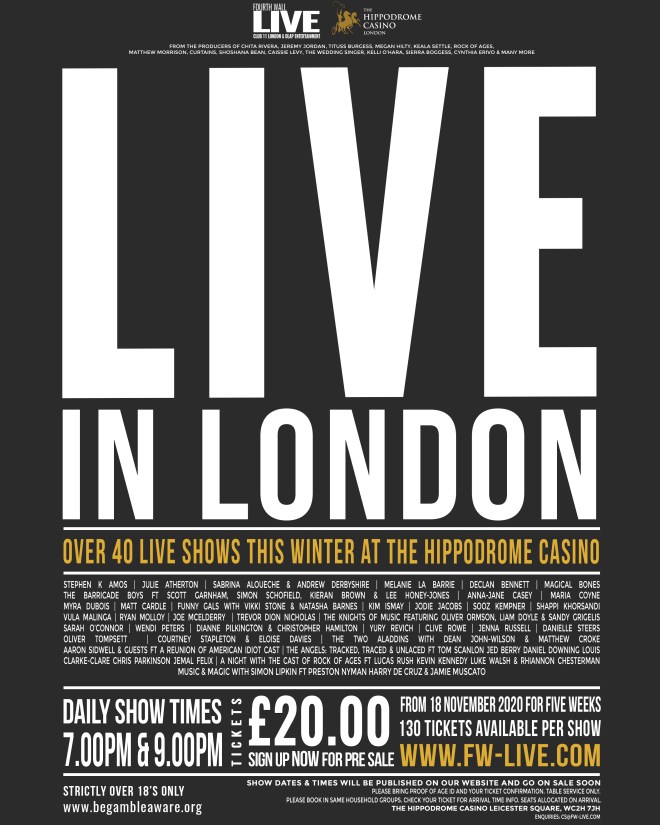 Fourth Wall Live and The Hippodrome Casino London are thrilled to announce a series of over 40 shows at the Hippodrome Casino this winter. The season runs from 18 November every week for 5 weeks and will include two shows nightly at 7.00pm and 9.00pm. The series will feature stars from the world of musical theatre, comedy and magic with all tickets priced £20. Audiences will be safely socially distanced following the most up-to-date safety guidelines. There will be 130 tickets on sale per show and tickets go on sale soon. Sign up at www.fw-live.com for advance pre-sale and further announcements.